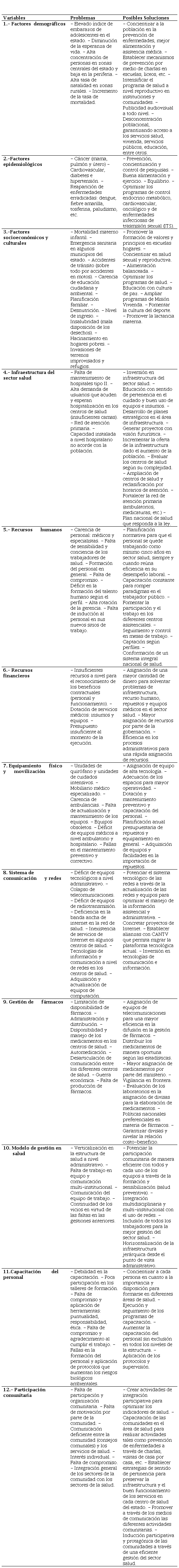 · En el escenario de conflicto, la propuesta de éxito estaría sustentada en varios aspectos: 1) incorporar personal eficiente en la toma de decisiones, es decir, con un alto nivel de preparación académica y experiencia en el sector salud; 2) implementar programas de planificación familiar y de enfermedades epidemiológicas para reforzar el conocimiento en las bondades del bienestar familiar y su entorno; 3) generar políticas públicas, empoderando el emprendimiento, la inversión y el acceso al empleo justamente remunerado para desarrollar bienestar colectivo y 4) vincular el sector público con el sector privado, para generar sinergias en pro de la sociedad, las cuales estarán relacionadas con acciones de consenso que lleven a mejorar la productividad por medio del uso de tecnologías de información y comunicación.