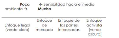 Dentro de la administración verde se manejan diversas visiones, también llamados enfoques verdes, que son aquellos que señalan la sensibilidad mostrada por las organizaciones hacia el medio ambiente, al respecto Coulter y Robbins (2010) utilizan tonos verdes para describir los diferentes enfoques que las organizaciones pueden adoptar, los cuales se pueden apreciar en el gráfico N° 1