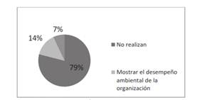 En cuanto a los informes, que son documentos detallados que liberan las organizaciones sobre su desempeño, Coulter y Robbins (2010) resaltan que estos informes generalmente describen las numerosas acciones de las organizaciones con el fin de promover la sustentabilidad ambiental, en este caso los resultados obtenidos arrojaron que un 79% no realiza informes que demuestren la gestión ambiental, mientras un 21% si lo hace. Ante los datos anteriores, se puede apreciar que los Contadores Públicos no realizan informes que demuestren la gestión ambiental de la oficina. El desarrollarlos daría a conocer a su entorno lo que están haciendo en materia ambiental; derivaría en un mejor posicionamiento ante sus clientes, colegas y otros entes interesados, y demostrarían los avances y el compromiso que llevan a cabo en materia ambiental.