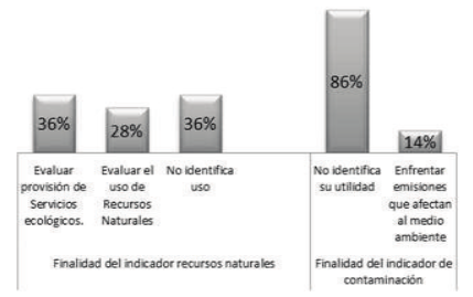 Al consultar sobre los usos del indicador de recursos naturales, el 36% de los encuestados consideran el uso de este indicador les permite evaluar la provisión de servicios ecológicos, en particular para contribuir a la vida del ecosistema y absorber los desechos de la actividad económica; 28% afirma que mediante el indicador de recursos naturales se puede evaluar el uso de los recursos naturales; sea agua, materias primas y energía; mientras el porcentaje restante (36%) no identifica de forma palpable un uso asociado con el indicador de recursos naturales.
