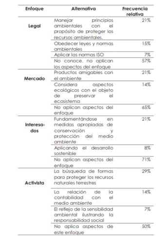 A continuación se presenta la tabla N° 1, la cual resume los hallazgos sobre los enfoques de la administración verde, mostrando los porcentajes de aplicación de cada uno de ellos por parte de los Contadores Públicos encuestados.
