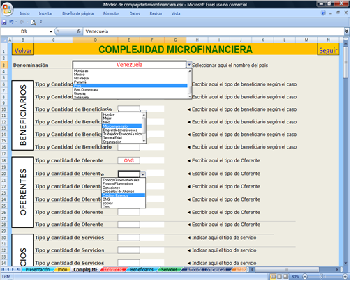Seguidamente encuentra la hoja 3, complejidad microfinanciera, donde se introduce información fundamental para el modelo y contiene listas desplegables elaboradas con las características de cada elemento, producto de los objetivos específicos propuestos en este estudio (Gráfico N° 2).