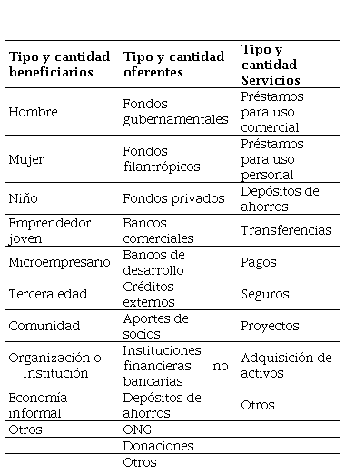 En esta línea expositiva, el objetivo general del presente trabajo consiste en proponer un modelo que consolide la complejidad de las microfinanzas y su contribución para el desarrollo de los países latinoamericanos a través de la identificación de características comunes del sector, los principales elementos del desarrollo vinculados con este y el diseño de un prototipo computarizado.