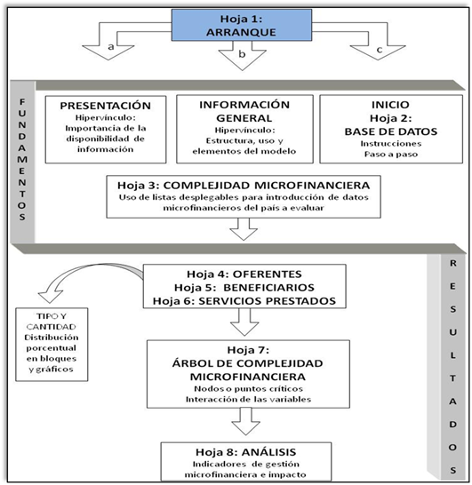 En el flujograma anterior se puede apreciar que la hoja 1, ARRANQUE, contiene: (a) Presentación, hipervínculo con una breve descripción sobre la importancia de la disponibilidad de información. El enlace (b): Información general, describe la estructura, uso del modelo y los elementos necesarios para su funcionamiento. Una vez que el usuario conoce la esencia del programa, pasa a utilizar el tercer enlace, (c): Inicio, que le conduce a la hoja 2, BASE DE DATOS, la cual contiene instrucciones paso a paso para su construcción.