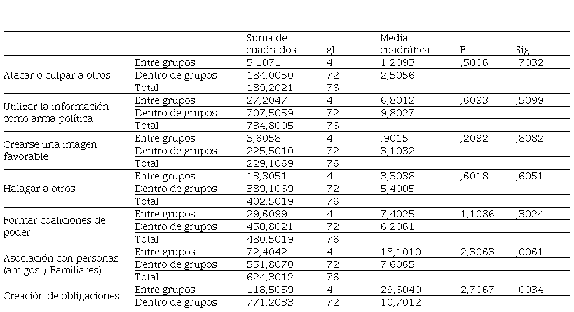 En el segundo análisis del ANOVA se planteó la hipótesis alternativa H0: No existen diferencias significativas en los valores medios de las puntuaciones de las tácticas políticas en función de la categoría de los encuestados. Con los resultados obtenidos se rechaza H0, dado que se observan diferencias significativas en las variables asociación con personas (Sig. 0.0061) y creación de obligaciones (Sig. .0034). Este resultado implica que los encuestados difieren en los usos de estas dos tácticas políticas entre los profesores universitarios que ocupan cargos directivos. Por tanto, se puede decir que la categoría académica no es una variable determinante para la utilización de estas tácticas políticas
