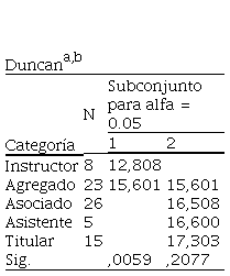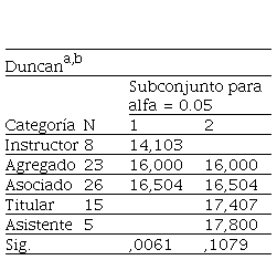 En este sentido, a las dos variables que arrojaron valores por debajo del grado de significancia 0,05 (asociación con personas y creación de obligaciones) se les aplicó un análisis post hoc para explicar el resultado obtenido (Tabla N° 3). Para esto se empleó la prueba de Waller-Duncan para determinar que media difiere de las otras medias, ello permitió establecer dos subconjuntos homogéneos de medias. El resultado de asociación con personas permitió apreciar la formación de un primer sub conjunto de categorías (instructor, agregado y asociado) con medias similares entre ellos y un segundo subconjunto donde las categorías agregado y asociado poseen medias similares. De esta manera, se comprobó que la existencia de estos dos subconjuntos impide lograr la significancia de esta variable.
