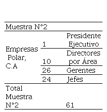 La segunda fase, comprendió la aplicación de la técnica de la encuesta y como instrumento un cuestionario, validado por expertos, integrado por 31 ítems con alternativas de respuestas tipo Likert a una población conformada por empresas del sector productivo de pasteurizados del Estado Carabobo y a una muestra conformada por personal directivo estratificado en diferentes niveles, específicamente en Corporación Inlaca, C.A y Empresas Polar, C.A. tal y como se evidencia en los siguientes cuadros: