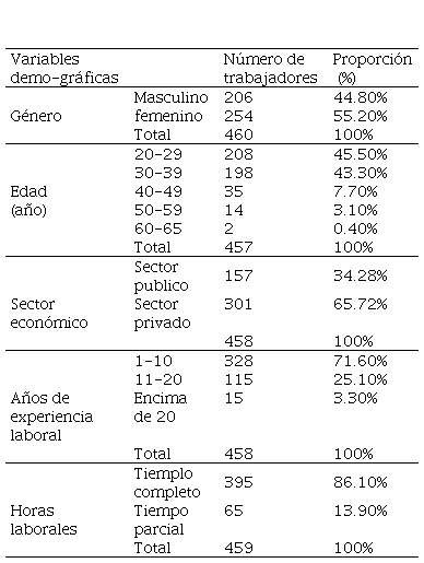 La tabla Nº 2, presenta un análisis descriptivo de los trabajadores de algunas variables demográficas de los trabajadores encuestados. De los 460 trabajadores encuestados el 55,2% son de sexo femenino y el 44,8% son de sexo masculino. La mayoría de los encuestados manifestó pertenecer al grupo de edad comprendido entre 20 y 40 años, seguidos por los grupos de edades entre 30 y 39 años que representa un 43,3%. El grupo más pequeño presenta una edad entre 60 a 64 años, por representar un 0,4% de los trabajadores. El 34,3% de los encuestados señaló trabajar en el sector público, mientras que el 65,7% indicó trabajar en el sector privado. Sobre la dedicación, el 86,1% de los encuestados indicó trabajar a tiempo completo, mientras que el 13,9% trabajar a tiempo parcial. Basado en los años de experiencia laboral el 71,6% indicó tener menos de 10 años trabajando en la organización; el 25,1% de los encuestados han estado trabajando al menos entre 11 a 20 años, mientras que el grupo más pequeño (3,3%) ha trabajado más de 20 años para la organización.