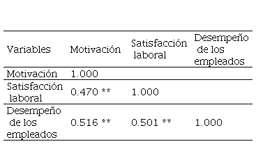 Al calcular el Coeficiente Rho de Spearman, sobre las variables ordinales estudiadas, La tabla Nº 2 ilustra una correlación positiva lineal moderadamente alta entre la motivación y el desempeño de los empleados con un 51,6%; también existe una relación lineal positiva entre la satisfacción laboral y el desempeño de los empleados con un 50,1%. Es de advertir que esta relación lineal positiva no implica relación de causalidad, como correlación. La relacionar las variables motivación y satisfacción laboral, las mismas muestran una relación lineal positiva ligeramente leve del 47%. Se indica que el desempeño de los empleados se correlaciona positivamente con la motivación y la satisfacción laboral con un valor de p de 0,000 que es significativo al 1%. De ahí que se pueda apreciar en las seis empresas estudiadas una variación conjuntas, parecidas y en la misma dirección entre las variables estudiadas, donde los trabajadores con mayor motivación, tendrán mayor o mejor satisfacción laboral y mejor desempeño.