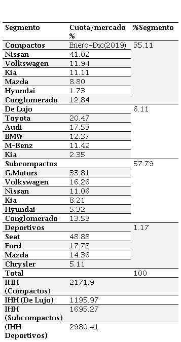 La estructura de la industria es oligopolística, compuesta por 32 empresas automotrices a Diciembre de (2019), según datos de la Asociación Mexicana de Distribuidores Automotores (2020), donde las empresas dominantes bajo el criterio de ventas por volumen de enero a diciembre de 2019 fueron Nissan, General Motors, Volkswagen, y Toyota con una concentración de 55.7 por ciento (Tabla 1), lo que indica una estructura oligopólica concentrada según dicho índice que toma como mínimo el 50 por ciento para ostentar dicha designación (Maya y Villegas, 2004). Por su parte, el índice de concentración IHH, arroja un resultado de 1095 puntos, lo que indica una concentración moderada porque dicho indicador entra en el rango de 1000 a 1800 puntos que contempla la clasificación mencionada (Tarziján y Paredes, 2012; Navarro et al., 2013). En este sentido, la información indica que la estructura de la industria no es competitiva, según los índices evaluación proporcionados.