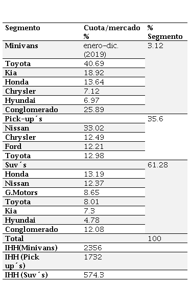 La tabla Nº 3 ilustra que el conglomerado ha logrado una penetración importante en segmentos como las minivans, donde acaparan el 25.89 por ciento del mercado, donde KIA es el segundo jugador en dicho segmento con el 18.92 por ciento y Hyundai la quinta posición con el 6.97 por ciento (Tabla 3) en un segmento altamente concentrado (índice IHH de 2356 puntos).