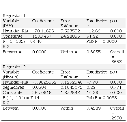 El primer modelo tiene un coeficiente de determinación de 0.6055 e indica que la cuota del conglomerado Hyundai-Kia es significativa al 99 y 95 por ciento de confianza, donde sus efectos son negativos ante el crecimiento del índice IHH o Herfindahl-Hirschman, específicamente al aumentar en una unidad la cuota de mercado del conglomerado Hyundai-Kia, el índice descenderá en 70.11 unidades en la concentración (Tabla Nº 4).