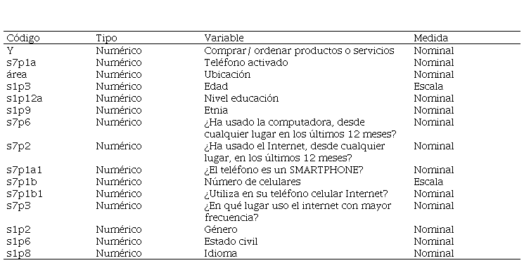 La información obtenida del Instituto Nacional de Estadísticas y Censos se simplificó en tres variables descriptivas para determinar la situación de los clientes que son objeto de estudio como son: acceso a un teléfono activado con internet, el uso de una computadora para realizar alguna actividad no necesariamente de comercio electrónico, y finalmente uso de internet no necesariamente para comercio electrónico. De esta manera los clientes o usuarios consultados que tuvieron dichas características fueron considerados para el estudio.