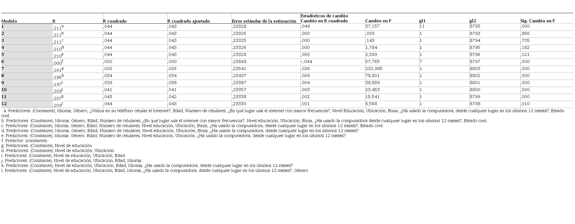 Con estos primeros resultados, se procedió a elaborar el modelo de regresión múltiple cuyo propósito es el de estimar los coeficientes de la ecuación lineal, para lo cual se establece una o más variables independientes que puedan predecir el valor de la variable dependiente. Como primer resultado de este proceso se obtiene una tabla descriptiva de los predictores del modelo.
