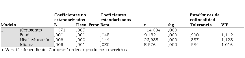 Se debe consideraR que la edad afecta considerablemente a la tendencia de una compra. Por lo general cuanto mayor es una persona tiene mayor poder adquisitivo lo que implica que puede comprar más productos o servicios. Sin embargo, el comprar en el internet depende del nivel de educación. Y el modelo demuestra que mientras su nivel sea mayor es más probable que pueda comprar por internet. Y finalmente un aspecto que puede influir es el dominio del idioma, se observa que mientras más domine otro idioma también tiene más tendencia a comprar por medios electrónicos.