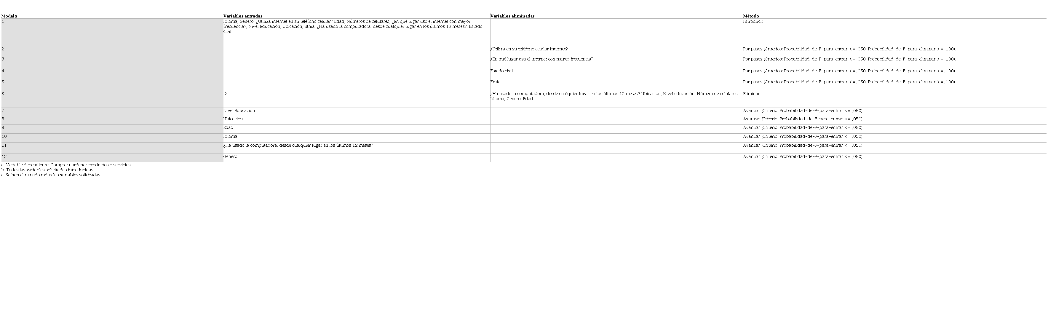A continuación, se presenta un resumen de los modelos que fueron procesados en el programa SPSS, cuyos predictores que mejor se adaptaron a un modelo predictivo fueron la edad y el nivel de educación y el uso de un segundo idioma, como características más propensas a realizar una compra en línea.