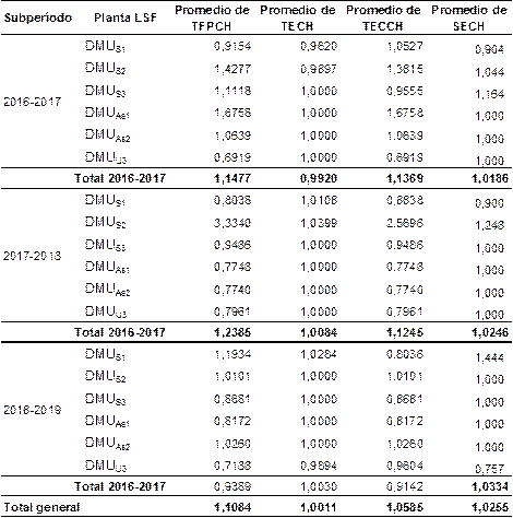 Otros hallazgos relevantes dan cuenta que la Planta o DMU1de LSF, que presenta productividad total de los factores decreciente en los subperíodos 2016-2017 y 2017-2018, en tanto que registró una mejora en el subperíodo 2018-2019,si bien esta última no fue suficiente para compensar las reducciones registradas en los subperíodos previos. Se observa así mismo un desempeño sobresaliente para la Planta o DMU2de LSF para el subperíodo 2017-2018, representado por una mejora de 2,57 en la eficiencia técnica, lo que implica una mejora en la tecnología o innovación.