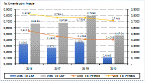 Dado el gran tamaño de las muestras utilizadas, los resultados de la estimación de los modelos de análisis envolvente para las PyMEs colombianas se presentan de manera ecléctica en los Gráficos 1a y 1b (gráficos de líneas superiores), en tanto que los de la empresa o DMU LSF se muestran en las barras verticales. Allí se puede observar que la eficiencia total y técnica promedio para las primeras exhibe una tendencia decreciente, tanto bajo la modalidad/tecnología de rendimientos/retornos variables a escala (VRS) como en los constantes a escala (CRS), sin importar si la estimación era con orientación inputs o outputs. Tales resultados evidencian una perdida sostenida de productividad en las PyMEs colombianas durante el período 2016-2019.