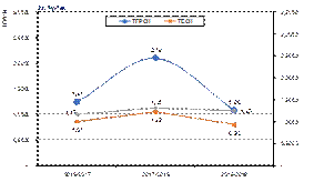 Por su parte, al analizar el caso de la DMU LSF (Gráfico 2b) se observa un comportamiento variable en el IPM, que exhibe un decrecimiento inicial (subperíodo 2016/2017), luego un fuerte crecimiento para el siguiente subperíodo (2017/2018, igual a 1,21) y finalmente una reducción significativa durante el subperíodo final (2018/2019, de 0,24). Tales resultados se ven inducidos principalmente por una reducción en la eficiencia, mientras que la eficiencia técnica denota un comportamiento estable por debajo de la unidad. Ello evidencia que la pérdida en la productividad total se relaciona directamente con una pérdida de la eficiencia de esta DMU durante el último subperíodo analizado.