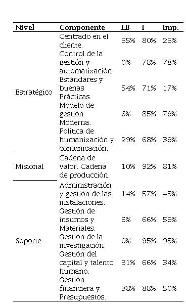 El impacto de cada macroproceso también se midió para cada uno de sus componentes (Tabla Nº 1). En el macroproceso estratégico, el mayor impacto se observó para el componente de control de la gestión y automatización con TIC. En segundo lugar, el nivel de gestión del componente modelo de gestión moderna, presentó un impacto del 79%. Además, se observa que, en el componente políticas de humanización y comunicación, la empresa presentaba un porcentaje muy bajo antes de la implementación, pero se elevó significativamente luego de la implementación, para un impacto de 39% en esta primera fase. Además de estos, los componentes restantes también mostraron un impacto positivo en la gestión.