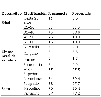 Las características sociodemográficas recolectadas en las unidades de estudio, fueron: el sector y el tamaño de la empresa, y el sexo, la escolaridad y edad de los encuestados. Según la Tabla Nº 1, la mayoría de los empresarios son personas jóvenes, ya que el 67.1% tienen como edad máxima 40 años, siendo la edad predominante entre 31-40 años (33.6%); por otro lado, se presenta que el 67.1% de los encuestados posee estudios de licenciatura y posgrado, es decir, la mayoría de los individuos cuentan con estudios a nivel superior, aspecto que puede ser de influencia en los resultados posteriores. Por su parte, la participación empresarial se presenta con una leve tendencia hacia el sexo masculino (50.4%); sin embargo, las mujeres (48.2%) tienen también una importante representatividad en el contexto.