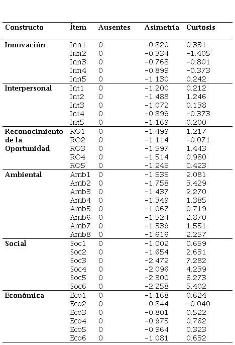 Inmediatamente, se llevó a cabo el análisis exploratorio de los datos, en donde se evaluaron los datos ausentes, la asimetría y curtosis, la correlación de datos, y se llevó a cabo el Análisis Factorial Exploratorio (AFE). Dentro de los resultados obtenidos (Tabla Nº 3), se puede observar que no se presentan datos ausentes; así mismo, la desviación en la distribución de la normalidad para la innovación, la interpersonalidad, el reconocimiento de la oportunidad, y lo económico se mantienen inferiores al (+/-)2, según lo recomendado por Lloret-Segura et ál.et ál. (2014) y Muthén y Kaplan (1992), mientras que los indicadores de ambiente y lo social se presentan principalmente con una leptocurtosis, es decir, con datos de la muestra concentrados en la media.