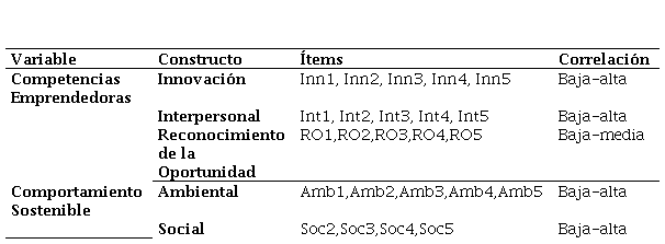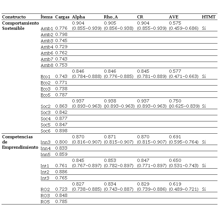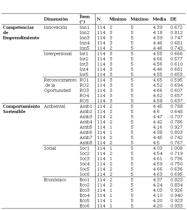 Para llevar a cabo la evaluación estadística descriptiva de cada constructo, se analizaron los datos atípicos, el valor mínimo, máximo, la media, y la desviación estándar de cada medida utilizada (TablaNº 2), en donde se puede mencionar la eliminación de observaciones que presentaban medidas atípicas, por lo que la muestra quedó finalmente en 114 observaciones en relación con los casos originales. Complementariamente, se menciona que el valor mínimo de respuesta para las competencias de emprendimiento fue 2 [Bajo] y el máximo fue 5 [Muy alto]; mientras que, para comportamiento sostenible, el valor mínimo fue 1 [Totalmente en desacuerdo] y el máximo fue 5 [Totalmente de acuerdo].