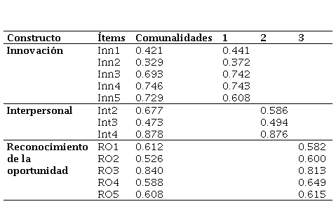 Luego de lo anterior se puede hablar de una representatividad por parte de los ítems a un nivel bajo (<0.5), modesto (0.5), y alto (>0.6), explicando con esto el 62.46% del total de la varianza (nivel satisfactorio considerando el 60% sugerido) a través de tres factores con cargas superiores a 0.500, a excepción de Inn1, Inn2, Int3 que permanecen en un rango de 0.372-0.494, y cuya eliminación se consideró posteriormente en el análisis de ecuaciones estructurales; no obstante, Int1 e Int5 decidieron eliminarse, ya que su retención disminuiría los niveles antes descritos (Hair et ál., 2014). Derivado de lo anterior, se puede comprobar empíricamente la conformación teórica brindada a cada uno de los constructos de la variable.