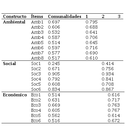 donde la menor representatividad es por parte del itemSoc1 (0.245); sin embargo, su retención no provoca efectos negativos, por lo que se decide mantenerla. El 60.89% de la varianza es explicada a través de sus ítems, a un nivel satisfactorio tomando en cuenta el valor mínimo sugerido de 60%, y conformándose así tres factores con cargas superiores a 0.600, a excepción del item Soc1 que obtiene un 0.414 relacionándose en esta medida con la comunalidad descrita anteriormente (0.245) (Hair et ál., 2014). De esta forma se presenta la comprobación empírica de la conformación de los tres constructos de la variable.