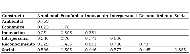 Para comprobar la no repetición en la explicación por parte de los indicadores, se hizo uso del análisis del Alpha de Cronbach y de la CR. Los resultados obtenidos mantienen un valor de 0.861 tanto para el Alpha como para CR, por lo que los indicadores se presentan como no reiterativos (Cheah et ál., 2019; Hair et ál., 2019).