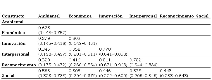 Seguidamente, se evaluó la correlación entre las medidas de los constructos para corroborar la pertinencia de explicación de las variables en estudio. A partir de los resultados (Tabla Nº 4), se establecen correlaciones en un rango de bajas a altas, tomando en consideración los niveles como inapropiadas (<0.3), bajas (0.3-0.5), medias (0.5-0.7), y altas (0.7-0.9) (Galván et ál., 2019). Lo anterior se presenta a un nivel de significancia al 0.01 bilaterial; por lo que hasta el momento, no se recomienda la eliminación de ítems (nivel de significancia estadística al 0.01).