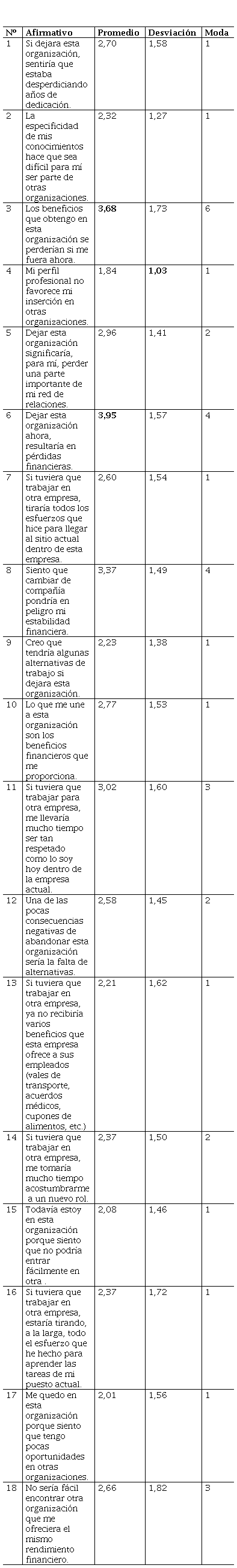 Las declaraciones que alcanzaron el promedio más alto fueron: “Dejar esta organización ahora resultaría en pérdidas financieras” y “Los beneficios que recibo en esta organización se perderían si me fuera ahora”, mostrando valores de 3.95 y 3.68 respectivamente. Valores considerados como medianos más altos en el parámetro de análisis del constructo (Gráfico Nº 1. Ambas declaraciones forman parte de la dimensión Arreglos burocráticos Impersonales (ABI), correspondiente a las percepciones del individuo con respecto a la estabilidad y las ganancias que se perderían si dejara la organización.