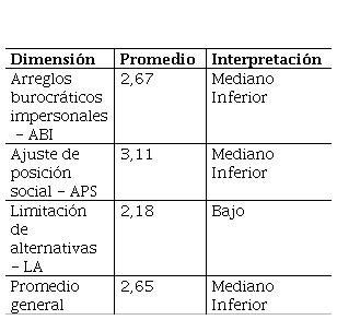 Como se puede comprobar, los encuestados logran un arraigado medio con la empresa en la que trabajan. La dimensión Limitación de AlternativaS (LA) alcanzó un valor bajo, o medio más bajo, frente a las demás dimensiones (ABI y APS). El desempeño de la dimensión de Ajuste de Posición Social (APS), en promedio más alto, refleja que las inversiones realizadas por los individuos para el mejor desempeño de sus actividades profesionales ejerce mayor impacto en el atrincheramiento organizacional que las ganancias financieras (ABI) y la visión del mercado externo (LA).