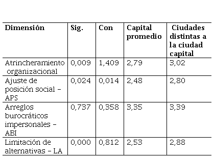 Se realizó una agrupación de las ciudades del estado de Rio Grande do Sul, Brasil, para verificar la existencia de diferencias de percepción sobre las dimensiones del atrincheramiento organizacional, según la ubicación en la que reside el individuo. Para ello, los encuestados se dividieron en dos grupos, los que residen en la capital del estado, Porto Alegre, y los participantes que residen en el resto del estado. Para ello, se aplicó una prueba t, y en este caso, se encontró que hay una diferencia significativa en la percepción de los dos grupos. La Tabla Nº 8 muestra los resultados de la prueba.