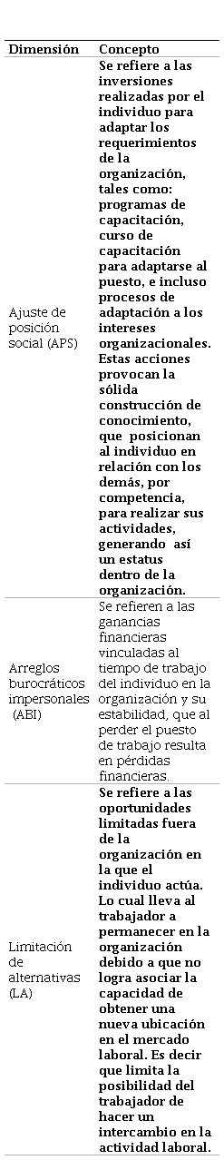 También, los autores Rodrigues y Bastos (2015) destacan que, la dimensión Limitación de Alternativas (LA) esta asociada a la percepción del individuo sobre las restricciones en el mercado exterior, dadas por su perfil profesional de difícil aceptación por otras organizaciones, y por limitaciones específicas como la edad, el conocimiento, entre otras. Los autores además ejemplifican que, en la dimensión Arreglos Burocráticos Impersonales (ABI), referidas a la estabilidad y las ganancias financieras al salir de la organización, están marcadas por la pérdida de beneficios, la participación en las ganancias, la pensión médica, dental, privada y otras remuneraciones variables adquiridas por el trabajador a lo largo del tiempo, que no necesariamente recibiría en la nueva organización.