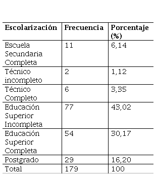 Se verifica que los participantes de la investigación tienen un nivel de educación considerablemente alto, ya que el 89,38% exhiben estudios superiores (incompletos y completos), y aproximadamente el 5% están asistiendo o ya han asistido a un curso técnico, posterior a la finalización de la segundaria.