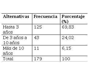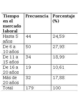 Aún evaluando los datos de la trayectoria profesional, se les preguntó sobre el tiempo de acción o antigüedad de los individuos en la empresa al momento de ser interrogados. En este sentido, hubo una variación temporal, de un mes a 20 años en la empresa. La Tabla Nº 5 muestra la distribución de la siguiente manera: