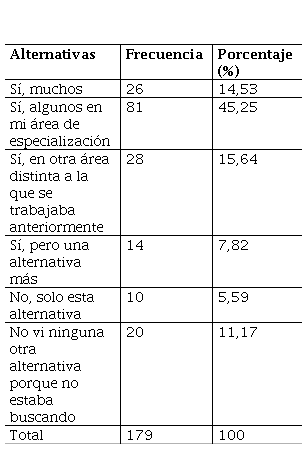 Aun con un número amplio de respuestas en las alternativas propuestas, el 45,25% indica que tenía oportunidades laborales en el área de actividad, el 14,53% afirmó que percibía muchas oportunidades, de la misma manera el 15,64% percibe oportunidades en otras áreas diferentes, en contraste con el 16,80% que señala no ver otras oportunidades.