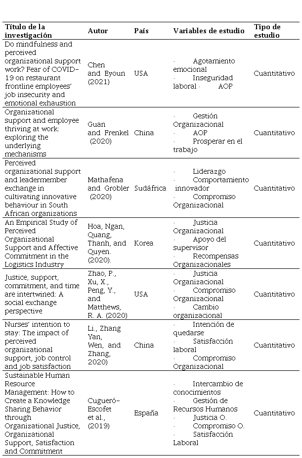 En el cuadro Nº 1 se aprecian las principales variables de estudio que se han abordado en los últimos 10 años, relacionadas con el apoyo organizacional percibido, entre las que sobresalen: compromiso organizacional, justicia organizacional, satisfacción laboral, comportamiento laboral, así como liderazgo y apoyo del supervisor.
