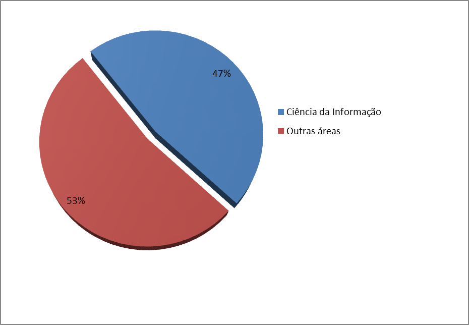 Ainda sobre o percentual das áreas citadas, exceto no caso da própria CI e da Administração, não foi percebida uma grande diferença pelo menos entre as dez primeiras áreas mais citadas que foram, nessa ordem: Ciência da Informação (47,38%), Administração (14,20%), Ciência da Computação (5,24%), Educação (5,14%), Sociologia (4,56%), Ciências (3,27%), Filosofia (2,99%), Comunicação (2,53%), Psicologia (1,78%) e Letras (1,76%).