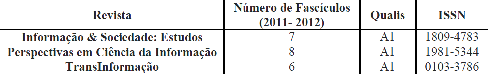 Os periódicos que fizeram parte da amostra da pesquisa foram selecionados levando em consideração a avaliação Qualis aferida pela CAPES, publicada no ano de 2012. Assim, foram escolhidas três únicas publicações avaliadas nos estratos A (A1 e A2) dentro de sua área. Essas revistas foram analisadas considerando os dois últimos anos de publicação, 2011 e 2012, nesse sentido foram observadas três publicações avaliadas como A1, nenhuma publicação foi avaliada como A2. O Quadro 2 elenca os periódicos selecionados: