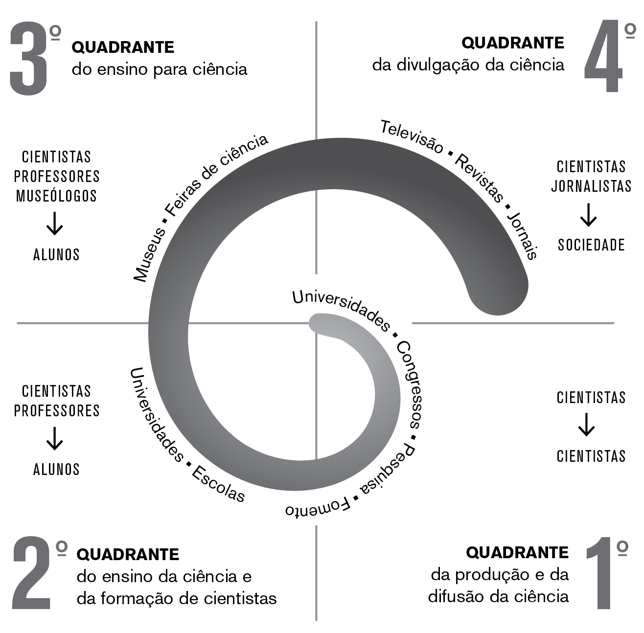 Essa dinâmica pode ser visualizada através da Espiral da Cultura Científica (Figura 1) criada por Vogt (2003). A curva do conhecimento, em movimento espiral, ganha amplitude na relação tempo e espaço (eixo vertical) e estabelece elos na troca do saber entre atores e meios diferentes. Observa-se que cada quadrante busca atingir um público específico, com diferentes interesses e necessidades no consumo do conhecimento. A curva se desenvolve em sentido horário quando a descoberta nasce e é discutida entre pares, ganha amplitude quando o conhecimento estabelecido é repassado através do ensino da ciência, é apresentada do ensino para ciência e finaliza o ciclo com a ampla divulgação para a sociedade em geral. A curva retorna sempre a um ponto mais “[...] alargado de conhecimento e de participação da cidadania no processo dinâmico da ciência e de suas relações com a sociedade [...]” (VOGT, 2003, p. 6).