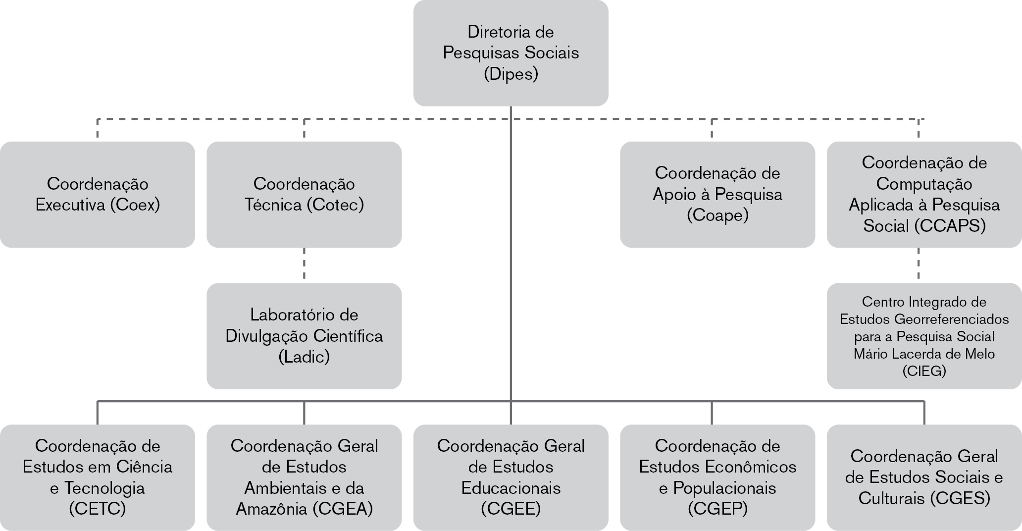 A Dipes/Fundaj, atualmente área de maior concentração de pesquisas na Instituição, contempla, em seus objetivos, a divulgação dos resultados das suas pesquisas à sociedade brasileira e possui a estrutura representada na Figura 2.