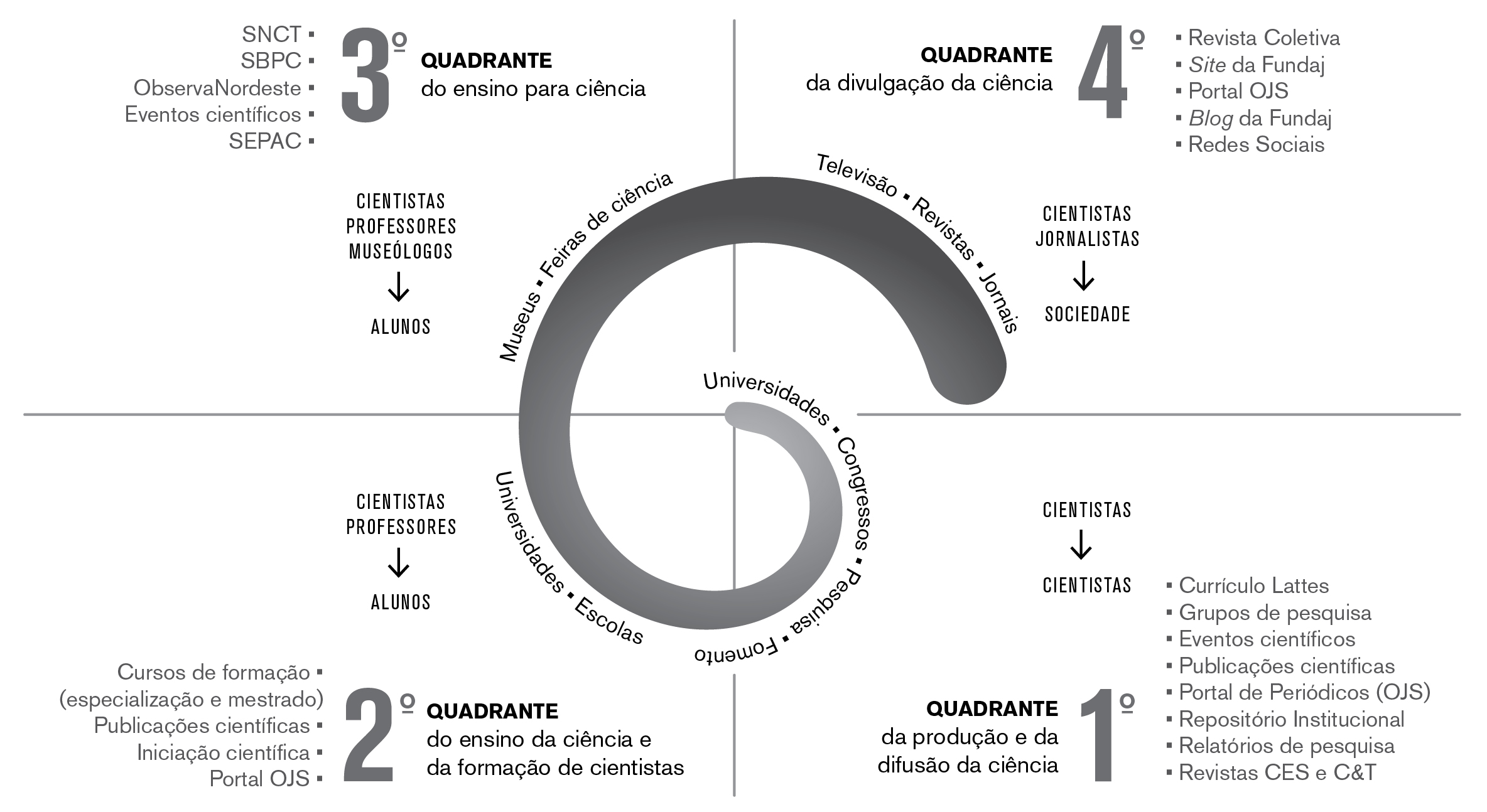Por conseguinte, busca colaborar com a preservação e a difusão de valores científicos e culturais, com a formação e qualificação profissional em diferentes áreas, inserindo-se, estrategicamente, nos quatro quadrantes da espiral proposta por Vogt. A partir de suas ações, sedimentadas pelos mais de 60 anos de tradição em pesquisa, cultura e educação, que contribuem efetivamente para a formação de uma cultura científica e promoção da ciência, tecnologia e inovação, disponibilizando-as para o grande público, a Fundaj foi vencedora da 32ª edição do Prêmio José Reis de Divulgação Científica e Tecnológica – 2012.