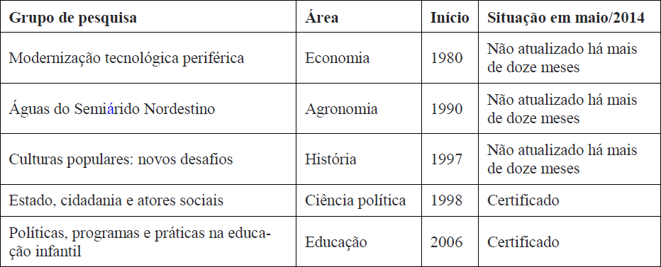 Ambiente virtual que abriga os grupos de pesquisa científica e tecnológica em atividade no país. É um banco de informações sobre o perfil da atividade científico-tecnológica, tornando-se importante ferramenta para o planejamento, gestão e memória dessa atividade no Brasil. Foram identificados apenas cinco grupos de pesquisa da Dipes no diretório do CNPq, dos quais três estão em inatividade, retratando o baixo envolvimento acadêmico da pesquisa na Fundaj, conforme discriminado no Quadro 2.