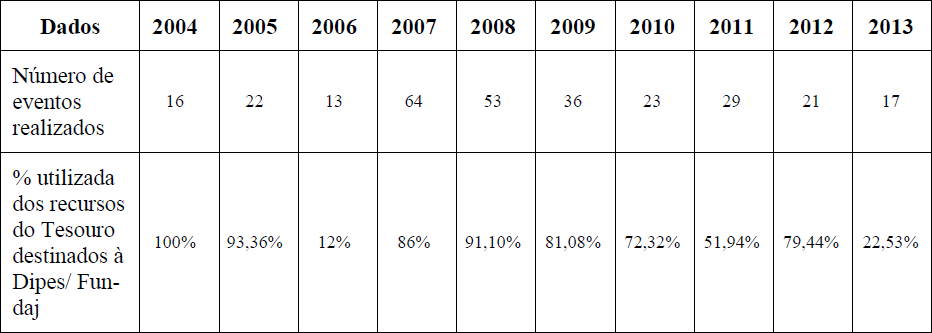 Os dados indicam que, apesar do aporte de recursos disponíveis, houve um número pequeno de eventos realizados, sofrendo uma queda significativa entre 2007 e 2013. A partir de 2010, os números apontam que a utilização dos recursos disponibilizados pelo Tesouro Nacional se manteve abaixo dos oitenta por cento.