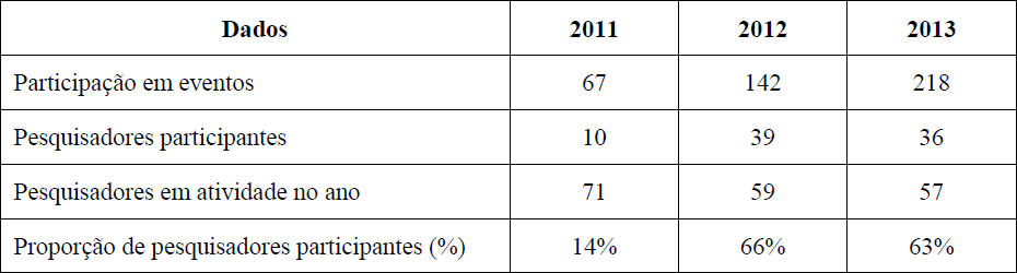 Os documentos só possibilitaram o exame dos dados a partir de 2011 e, nesse período, as análises revelaram que 14%, 66% e 63% dos pesquisadores da Dipes/Fundaj em cada ano, 2011, 2012 e 2013, respectivamente, participaram de eventos científicos. Foi observada, ainda, uma concentração da atividade em 66% do total de pesquisadores em efetivo exercício no período, entenda-se que esse percentual abriga a participação de um mesmo grupo de pesquisadores efetivos no período. Isso significa dizer que 44% dos pesquisadores efetivos, nesses anos, não participaram dessa ação.