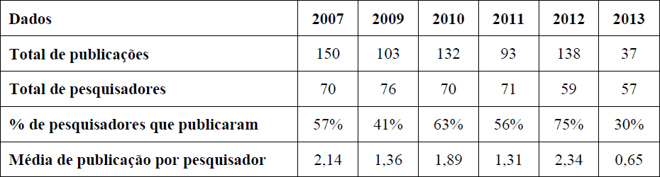 A disponibilização dos resultados das pesquisas pode atender a dois tipos de público: especialista e não especialista. Para os especialistas do meio científico, essa disponibilização pode ser realizada através das publicações científicas: ações do primeiro quadrante; para o público leigo, a informação deve ser levada por uma linguagem adaptada: quarto quadrante da Espiral de Vogt (2003). O Quadro 5 apresenta o panorama anual da produção por pesquisador. Ressalta-se que o quantitativo em relação ao período 2004 a 2006 e de 2008 não constam nos relatórios e demais documentos analisados, impossibilitando a verificação do período completo que compreende 2004-2013.