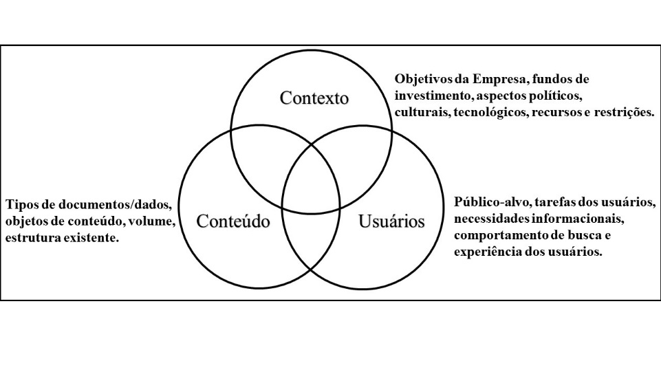 A Arquitetura da Informação “[...] não cria somente estruturas de navegação para sites, também integra as necessidades dos usuários como exigências. Atua como defensora dos usuários nos ambientes informacionais digitais” (EWING; MAGNU-SON; SCHANG, 2002, p. 5, tradução nossa). Morville e Rosenfeld (2006, p. 25) apresentam três pilares da Arquitetura da Informação, ilustrados na Figura, a saber: contexto, conteúdo e usuários.