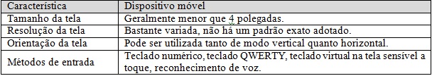 Fitzek e Reichart (2007) apresentam três características que representam as funciona-lidades dos dispositivos móveis: a interface com o usuário – através dos diferentes tipos de entrada e saída de dados; a interface de comunicação, – apresentado as di-ferentes formas de acessar a internet e trocar dados nos dispositivos móveis por meio de 3G, wi-fi e bluetooth; e os recursos internos, – que se referem à estrutura adotada nos dispositivos como unidade de armazenamento, processamento central e bateria. Nesse sentido, Firtman (2013) afirma que os celulares (smartphones) que possuem conexão com a internet, os tablets e os e-readers (leitores de livros digitais) são con-siderados dispositivos móveis. No Quadro 1 é apresentada uma síntese das principais características defendidas por Firtman (2013), entre elas a diversidade no tamanho, a resolução e orientação da tela e os métodos de entrada.